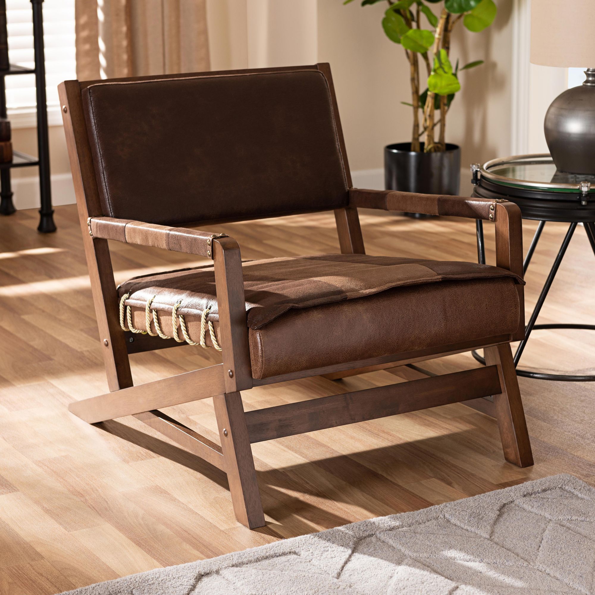 Rovelyn Brown Faux Leather And Walnut Wood Lounge Chair 69h37 Lamps Plus